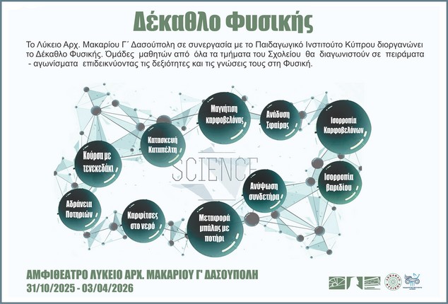 Το Λύκειο Αρχιεπισκόπου Μακαρίου Γ' Δασούπολη σε συνεργασία με το Παιδαγωγικό Ινστιτούτο Κύπρου διοργανώνει το "Δέκαθλο Φυσικής" για πρώτη φορά φέτος.